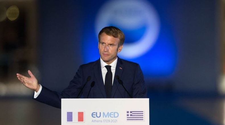 French President Emmanuel Macron addresses the press at the nine Mediterranean European Union member states (EUMED 9) Summit in Athens, Greece, on Sept. 17, 2021. (Xinhua/Marios Lolos)