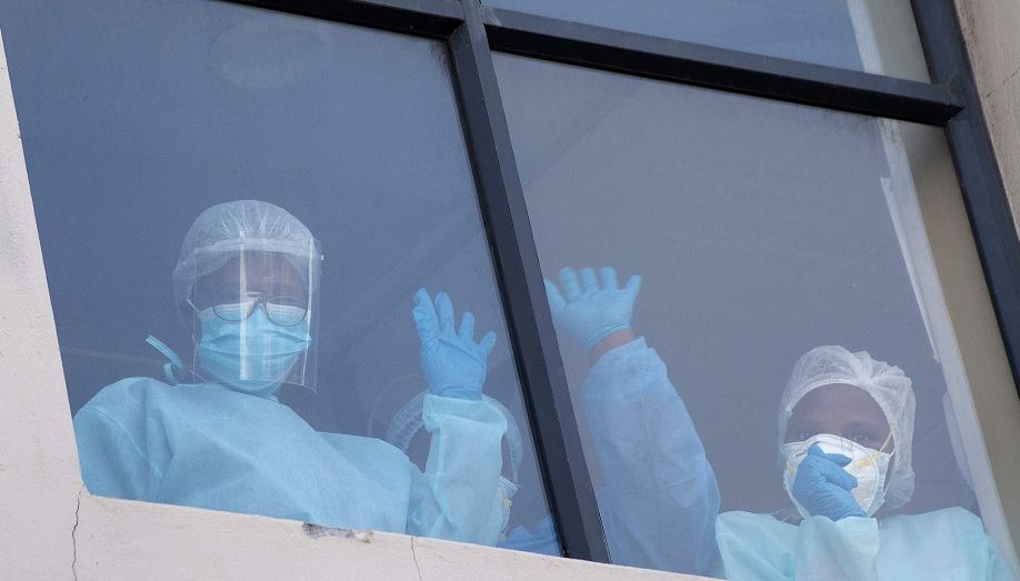 FILE PHOTO: Staff members in the COVID-19 ward at Rondebosch Medical Centre wave at people gathered outside, in Cape Town on January 14, 2021. (Photo by Rodger Bosch via CFP)