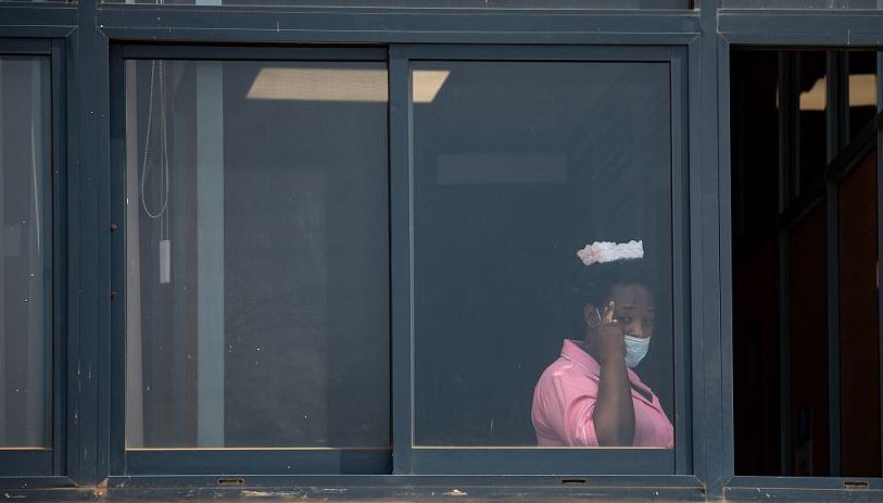 A healthcare worker stares from a window of the Mulago Hospital on March 10, 2021 in Kampala, Uganda. (Photo by Luke Dray/Getty Images)