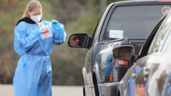 A medical worker collects a swab sample at a COVID-19 drive-through testing site in Los Angeles, California, the United States, January 10, 2022. (Xinhua)