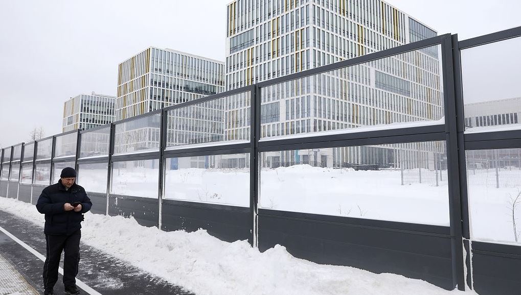 A man stands outside the Novomoskovsky multipurpose medical centre for patients with suspected COVID-19 infection in Kommunarka, Novomoskovsky District. (Photo by Mikhail Japaridze/TASS via CFP)