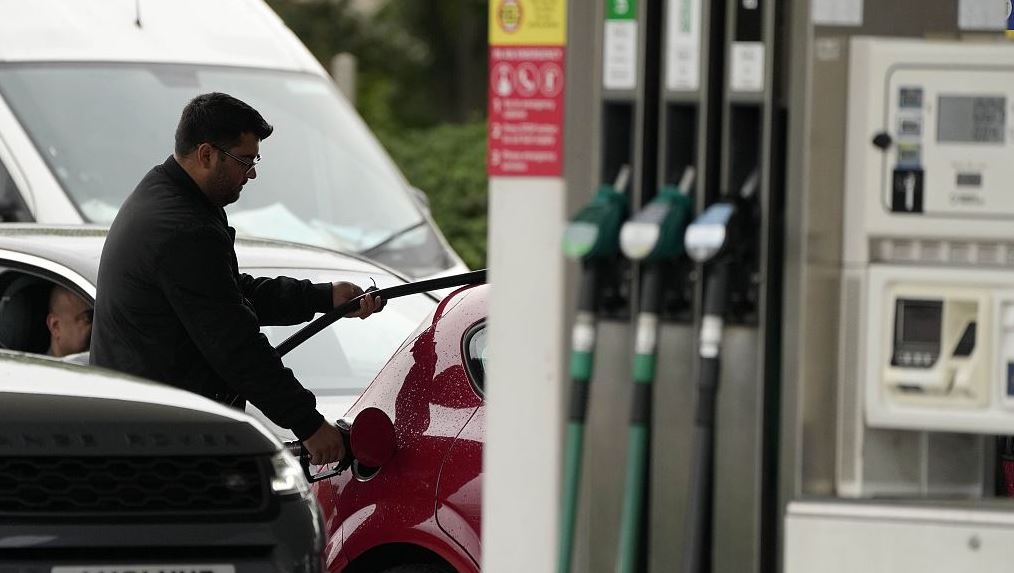 A man puts fuel in his car as drivers queue at a petrol station in London, Tuesday, Sept. 28, 2021. Long lines of vehicles have formed at many gas stations around Britain since Friday, causing spillover traffic jams on busy roads. (Frank Augstein via CFP)