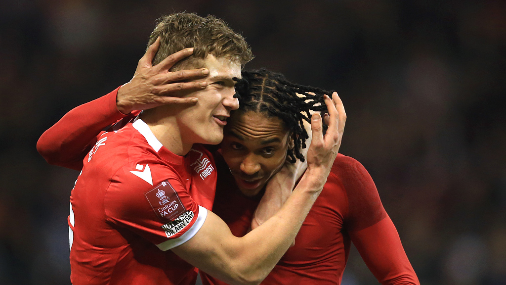FILE PHOTO: Joe Worrall of Nottingham Forest (left) celebrates victory with teammate Djed Spence of Nottingham Forest following a past Emirates FA Cup match. /CFP
