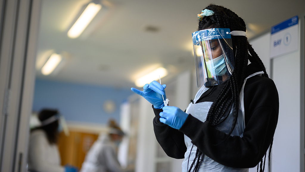 FILE PHOTO: A woman processes a swab test at a COVID-19 test centre in Bedford, England. /CFP