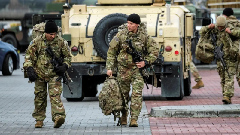 US soldiers from the 82nd Airborne Division walk near the G2A Arena following their arrival at Rzeszow-Jasionka Airport, in Jasionka, Poland February 8, 2022. (Patryk Ogorzalek/Agencja Wyborcza.pl via Reuters)