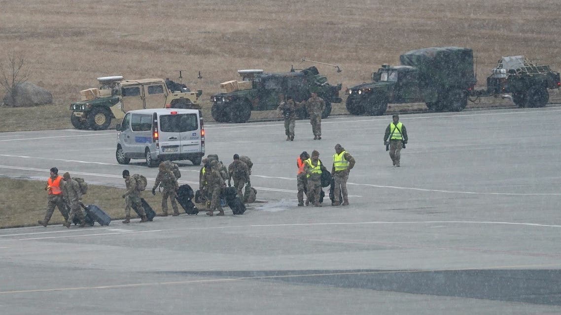 US troops walk from a US Air Force transport plane transporting military equipment and troops after landing at the Rzeszow-Jasionka airport in southeastern Poland, on February 6, 2022. /AFP