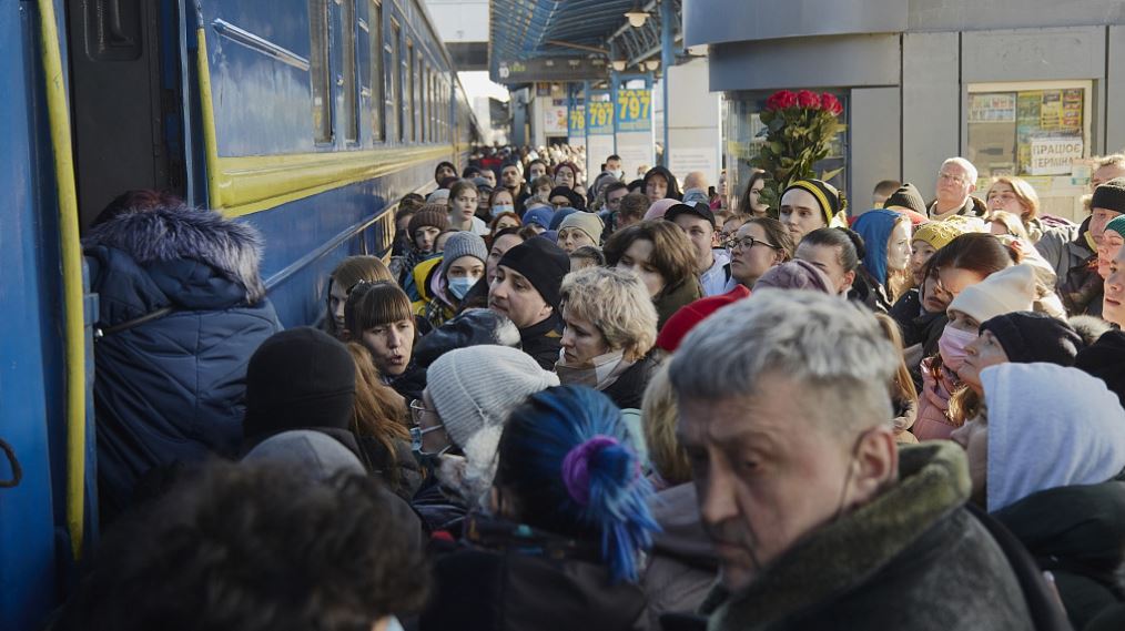 Residents board an evacuation train driving to the west of Ukraine in Kyiv, Ukraine, February 26, 2022. /CFP