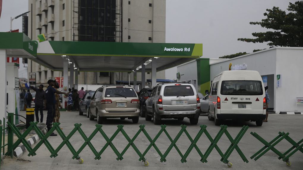 Cars line up outside a petrol station in Lagos, Nigeria, on February 18, 2022. (Photo by Sunday Alamba via CFP)