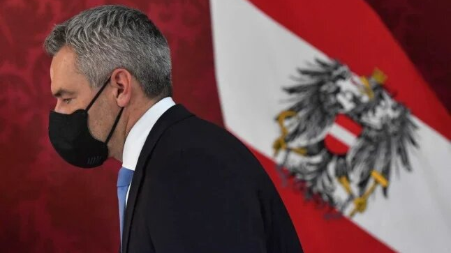 File Photo: Austrian chancellor Karl Nehammer walks past an Austrian flag wearing a mask. /AFP