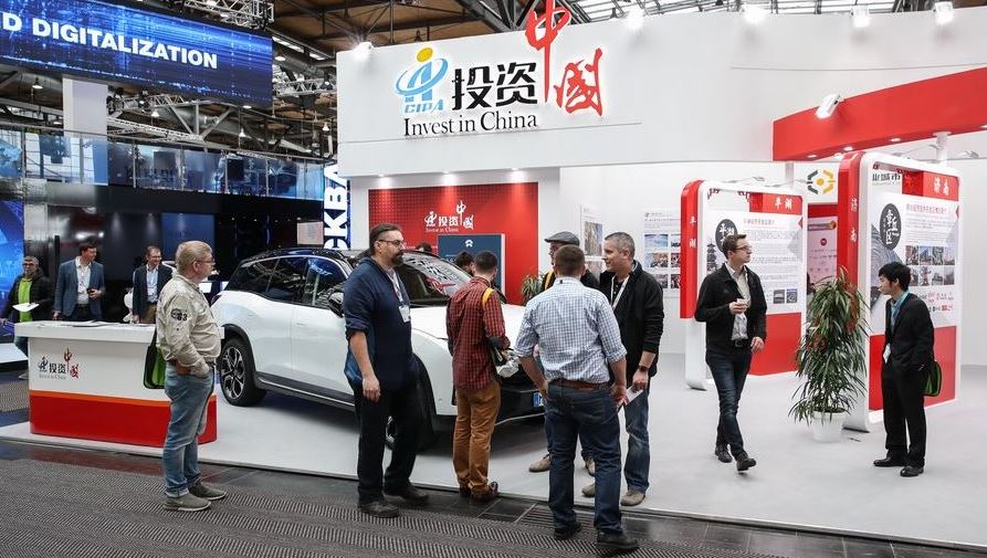 FILE PHOTO: Visitors view the booth of Invest in China at Hanover Fair 2019 in Hanover, Germany, April 2, 2019. /Xinhua