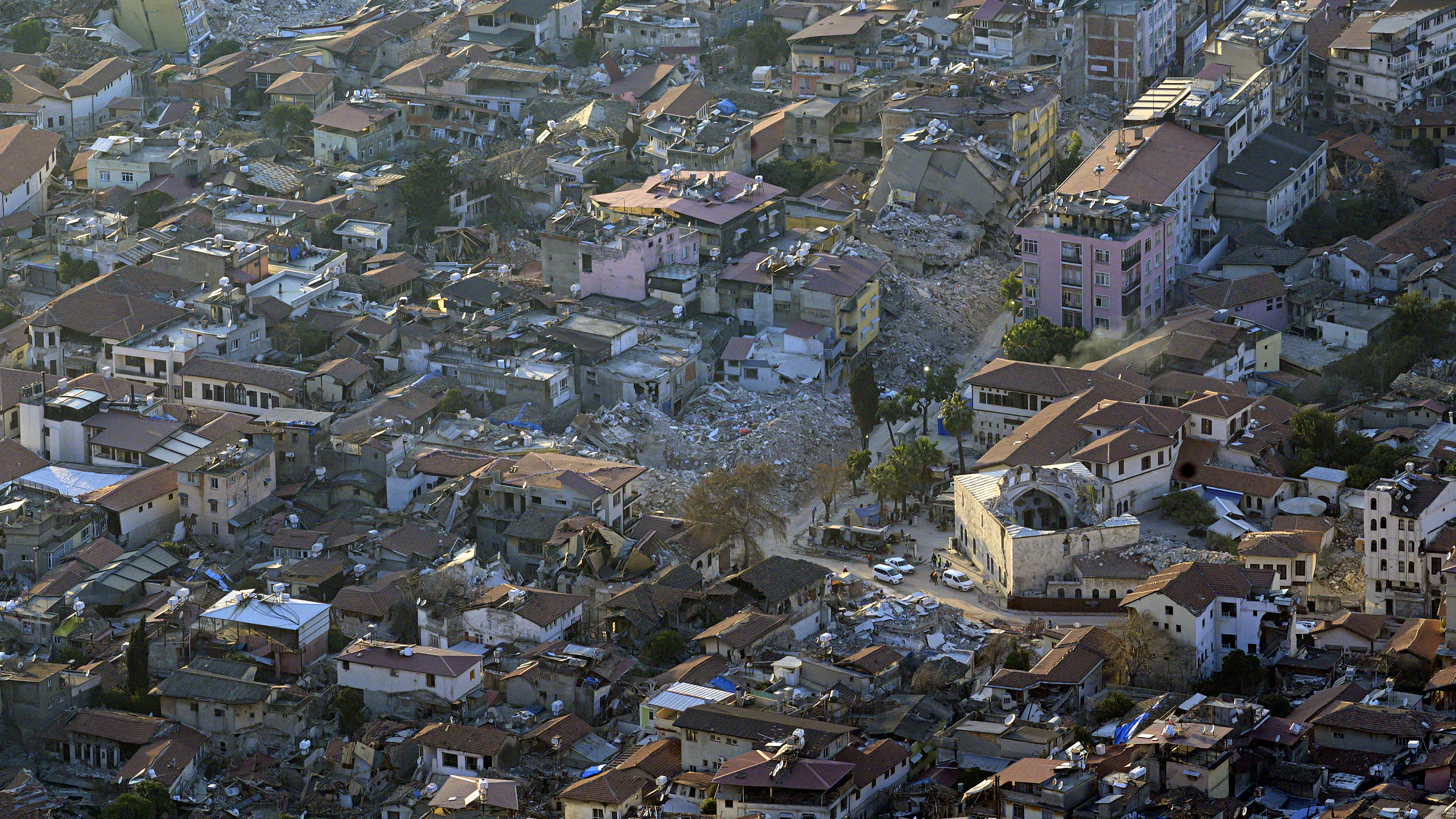 An aerial picture taken on February 20, 2023 shows collapsed buildings and houses in Antakya, southern Türkiye. / AFP