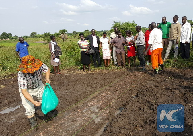 A Chinese expert shows locals how to sow hybrid rice seeds in Lira, northern Uganda, July 8, 2016. (Photo provided to Xinhua)