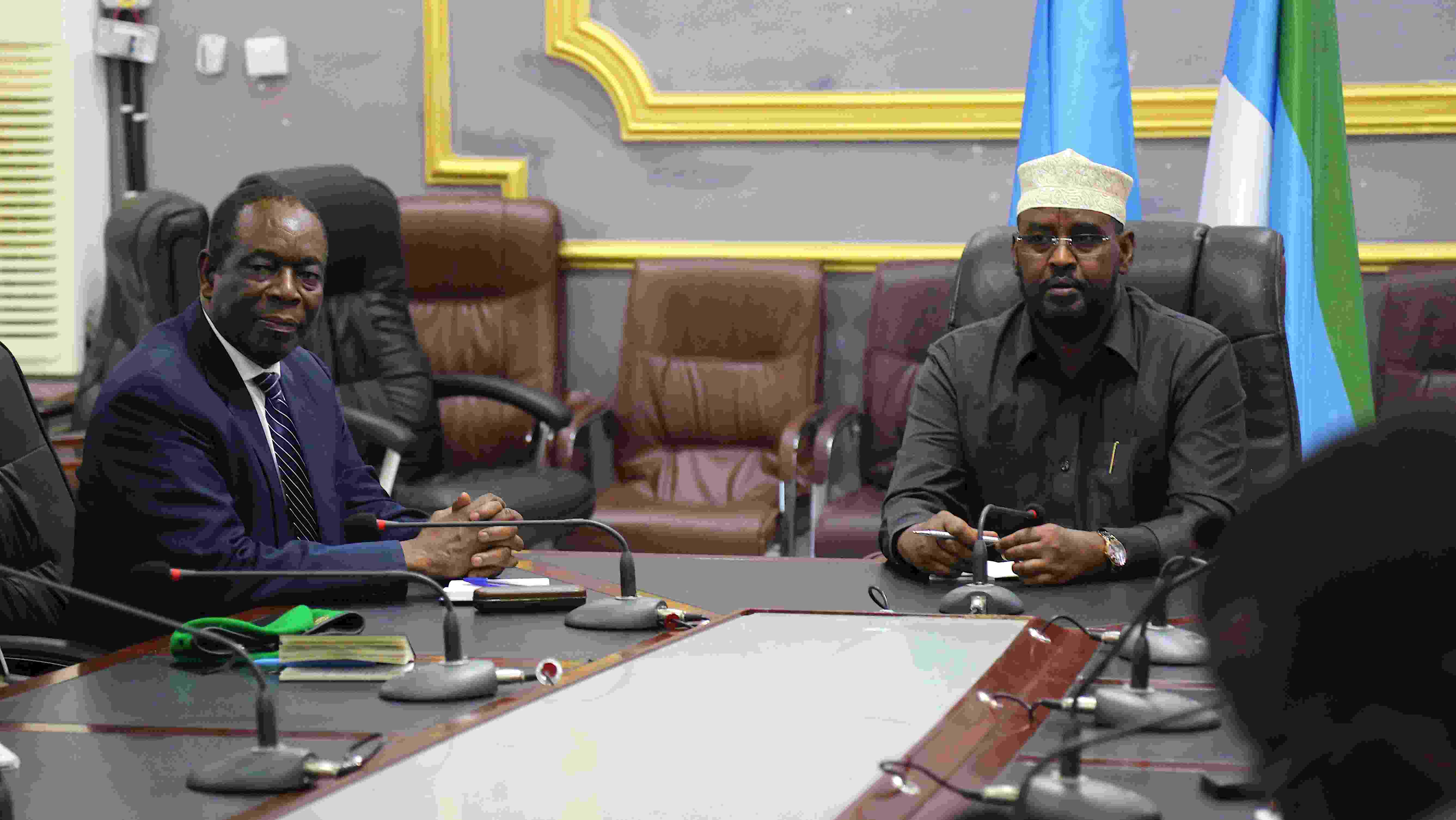 The head of the African Union Mission in Somalia (AMISOM) Ambassador Francisco Madeira met with the President of Jubbaland Ahmed Mohamed Islam Madobe in Kismayo on Tuesday to discuss the upcoming elections in the state and planned operations to secure the main supply routes in the region.